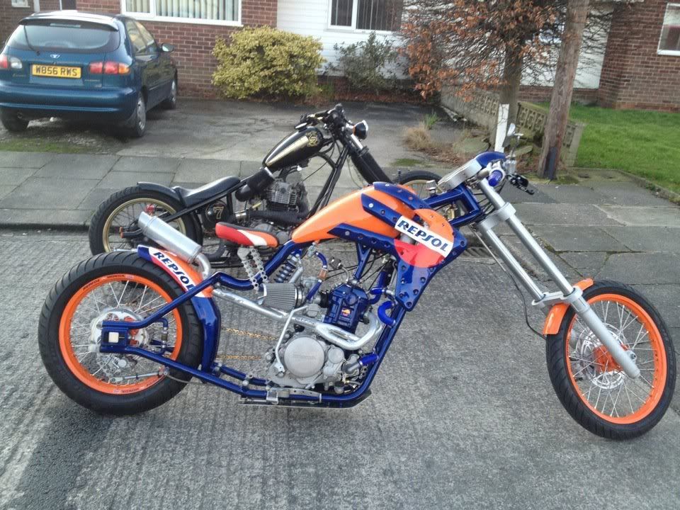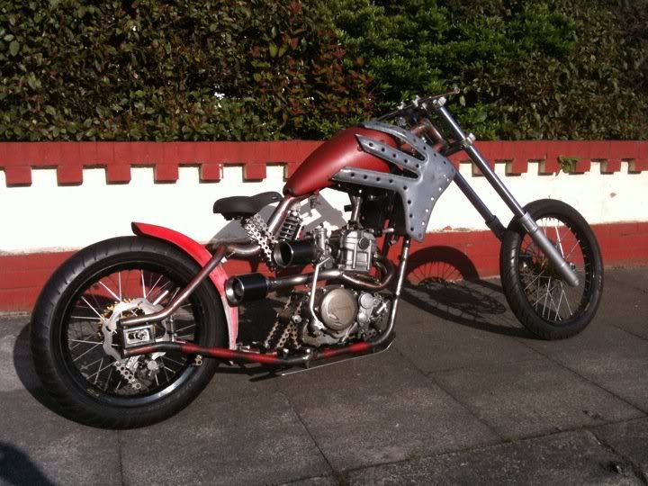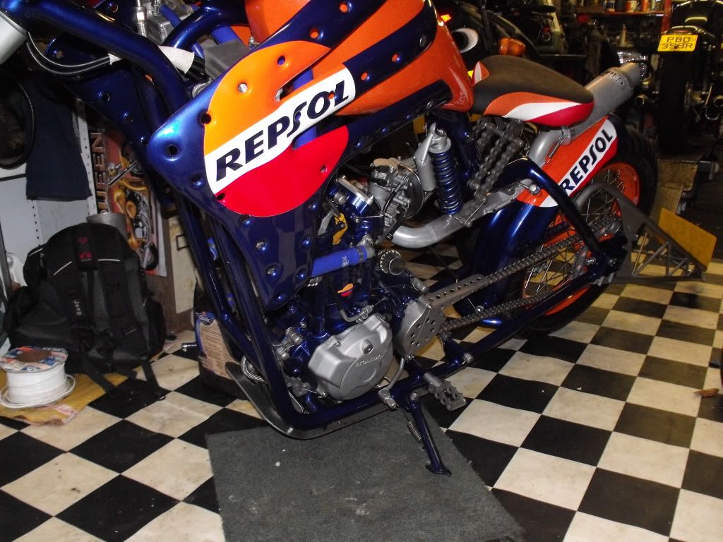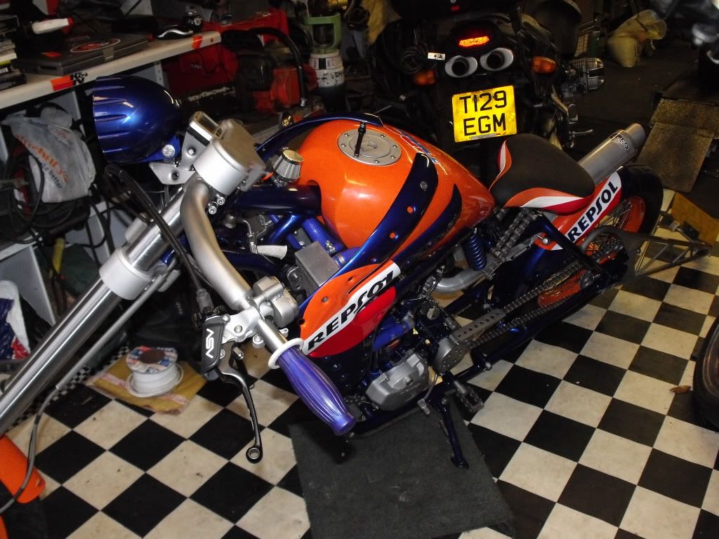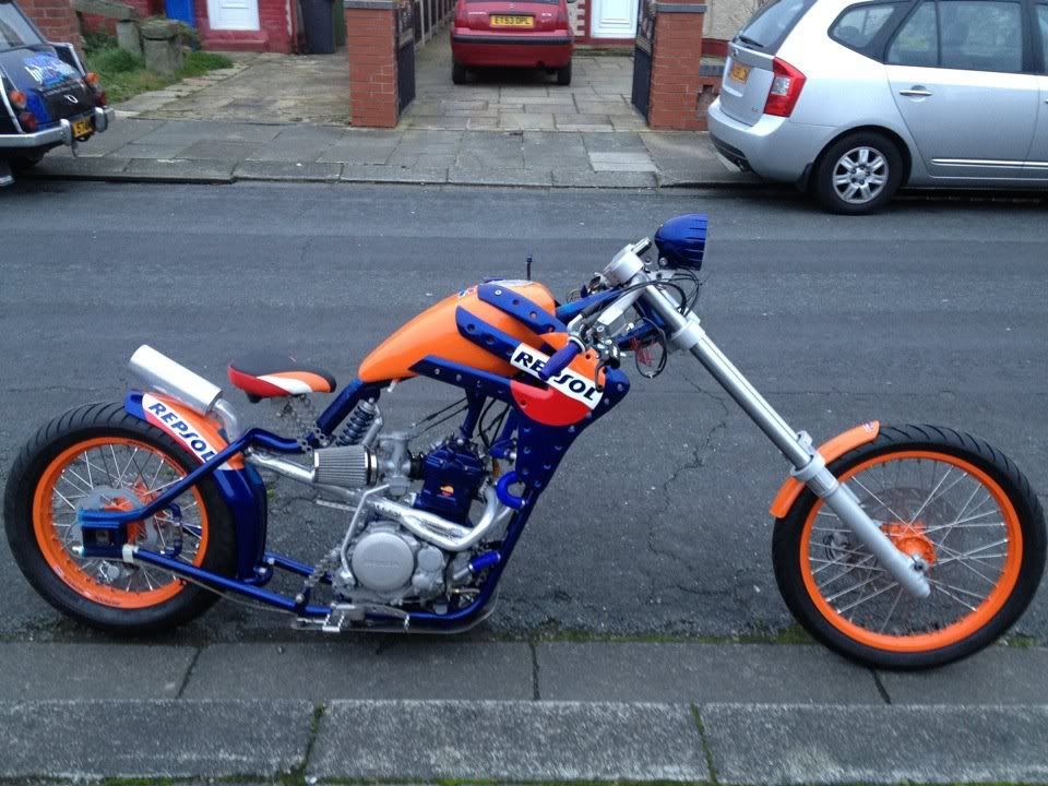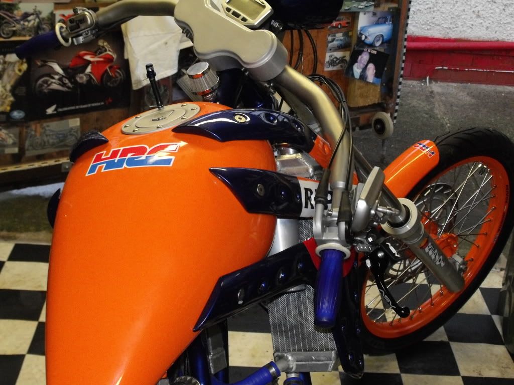 this is my mate grobbos latest custom offering. it started life a year or 2 ago as a stock ish xr650 honda, i remember taking him to collect it. since then its been rebuiolt from the ground up, i did a bit on his enginer, he did the rest, wheels, home made frame which in itself is a work of genius, as all the oil for the dry sump motor, and all the cooling water for the rads travels inside the frame to reduce the use of hoses, as is all the wiring. he built it as a crossover between a radical chop and the stripped down drag bikes of the 70's and 80's before everything got swathed in plastic, but as it was a honda race product, he quite liked the idea of using the honda repsol colourscheme, he designed and built the sprung and damped saddle which uses a mountain bike shock absorber to work, when the sun is shining, i will try and grab a few better pics of it outdoors in all its glory!