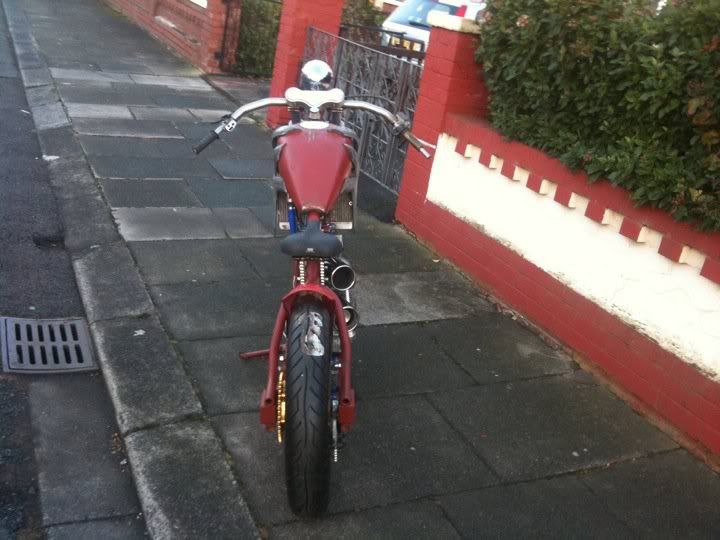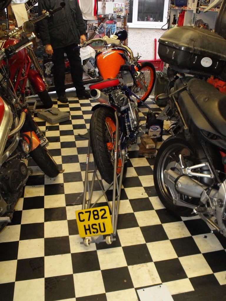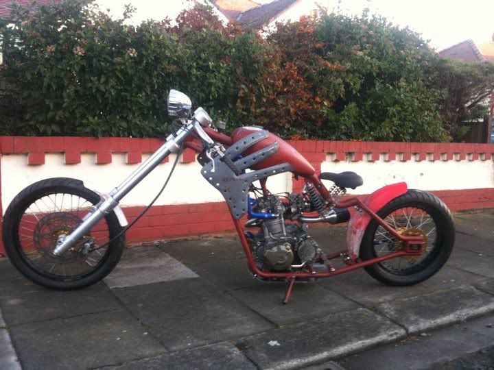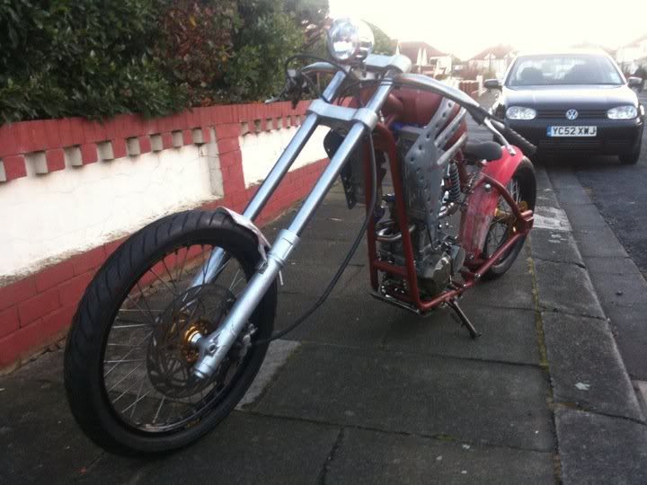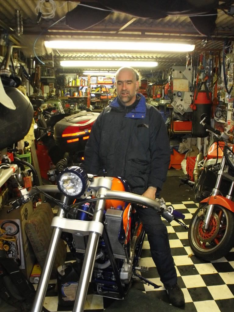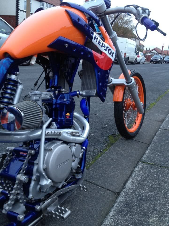 this is my mate grobbos latest custom offering. it started life a year or 2 ago as a stock ish xr650 honda, i remember taking him to collect it. since then its been rebuiolt from the ground up, i did a bit on his enginer, he did the rest, wheels, home made frame which in itself is a work of genius, as all the oil for the dry sump motor, and all the cooling water for the rads travels inside the frame to reduce the use of hoses, as is all the wiring. he built it as a crossover between a radical chop and the stripped down drag bikes of the 70's and 80's before everything got swathed in plastic, but as it was a honda race product, he quite liked the idea of using the honda repsol colourscheme, he designed and built the sprung and damped saddle which uses a mountain bike shock absorber to work, when the sun is shining, i will try and grab a few better pics of it outdoors in all its glory!