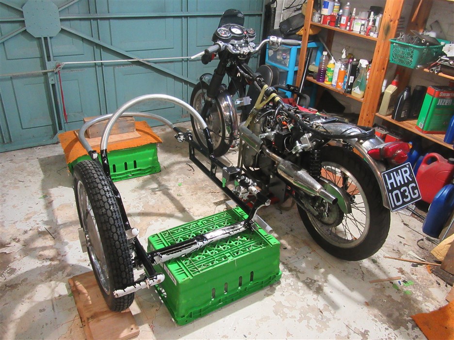 I'm now starting to get an idea of the setup. This is the chassis in position with 9" sidecar wheel lead, but a bit further away from the bike than it will end up to allow adjustments. As I thought the forward mounting on the chassis is far too far forward to be of any use so will need to make more split clamps. The body will be going off for paint at the beginning of March so no rush.