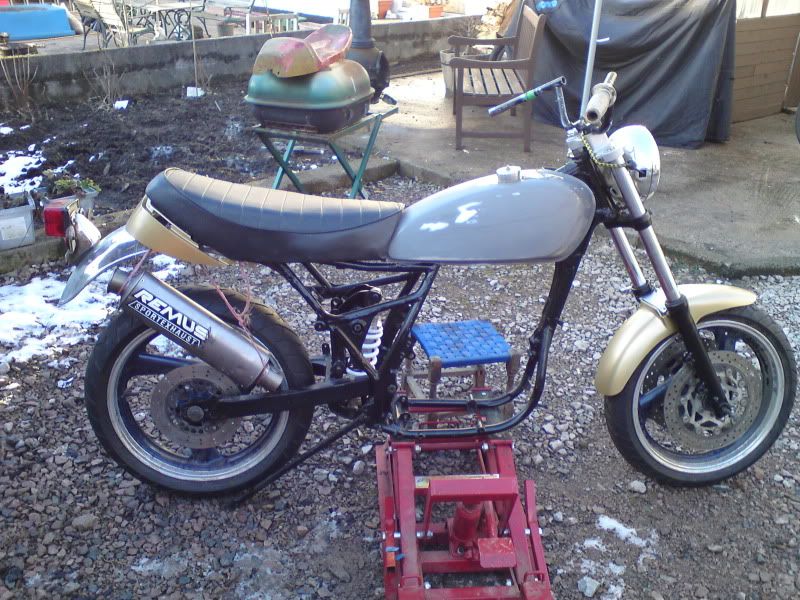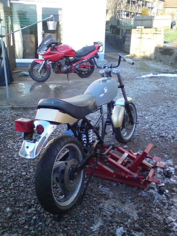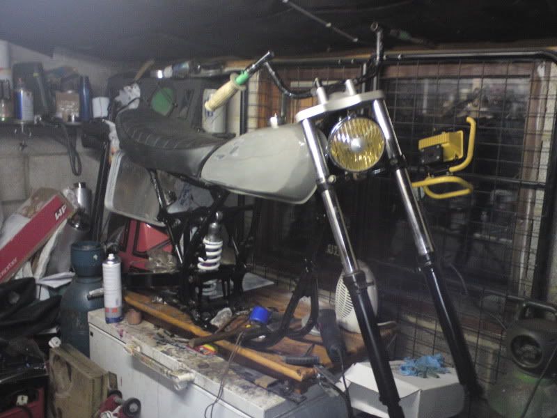 It is stupidly simple and unbelieveable how the SR rear guard fits, the bloody bolt holes couldn't line up better. I've got a list of jobs for tomorrow; I need to cut off and move the tank mounts, prep the tank for paint, locate the second spare SR sidepanel I have so I can extend them both, and also drill the top yoke to mount the instruments. Thankfully my mate has given me a couple of pilot holes already for that.
