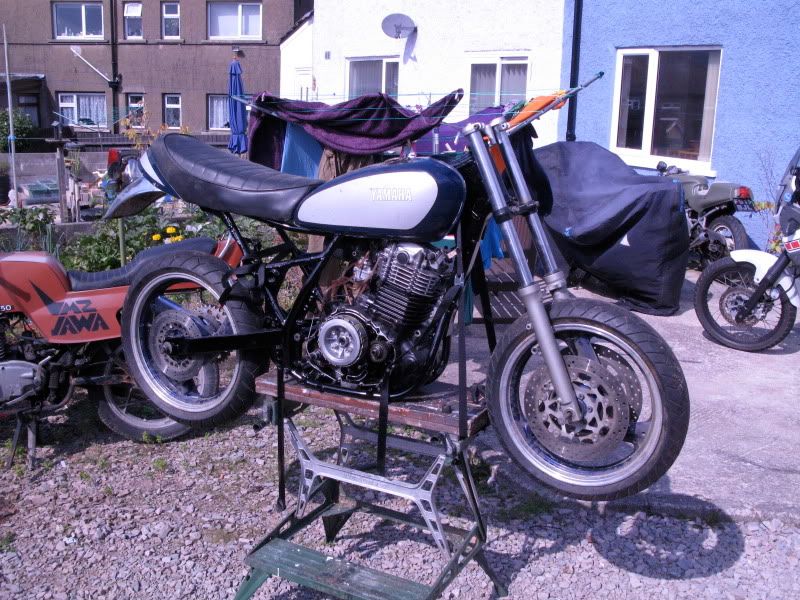 Well an early finish today (by 30mins) meant I got to spend some time titting about working on the bike. Now I have the awesome yoke from my mate I am able to get it on wheels which meant I could see how much I needed to drop the back end.