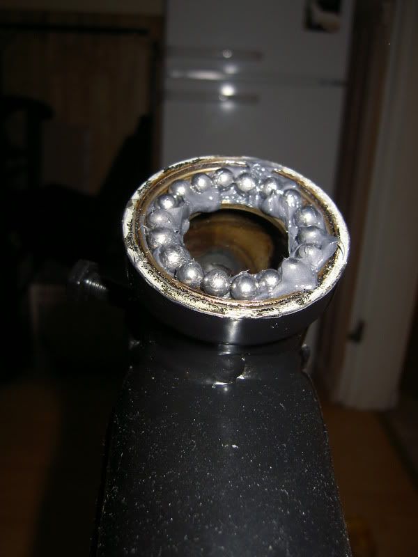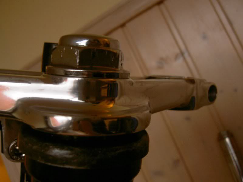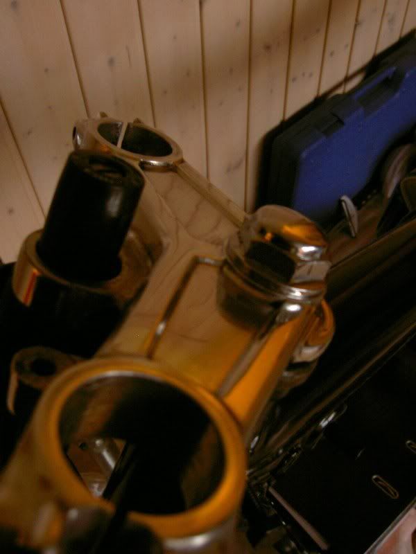 I needed to take the front end back off, because I couldn't help but look at it and think to myself "somethings definately wrong", and something was. It appears both my yokes are a bit twisted, hence forcing the wheel to steer right. As they are alloy and soft cast iron - there's just no way to make them 100% straight once bent. So I did the next best thing. I twisted them back "straitish" by hand. Tho I'm sure they arent 100% straight, theyre close and I'm going to roll with this and see how the bike steers. If the steering is still sh*t, then I'll find replacements for them.