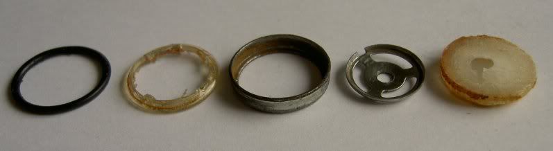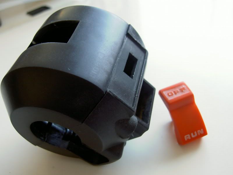 The internal components will be cleaned (the conductive surfaces sanded clean and all the springs will get fresh grease). Obviously this procedure removed the lettering from the part, but they can be applied later if needed. This one might get away without them since run/off reads on the button and the starter button will be disabled, so that leaves only the light switch unmarked and I think I can remember what it does