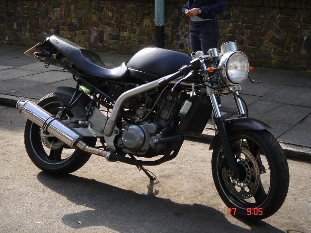 This photo is a bit old now, but it is still quite similar.  It has different clip ons, but is much the same.  Not exactly a looker, I think it was originally a Sport, but any Sport-specific parts have been removed.  Seat is ZZR 1100, headlamp is SRX, taillight is now Lucas-pattern.  Rev-counter now removed.