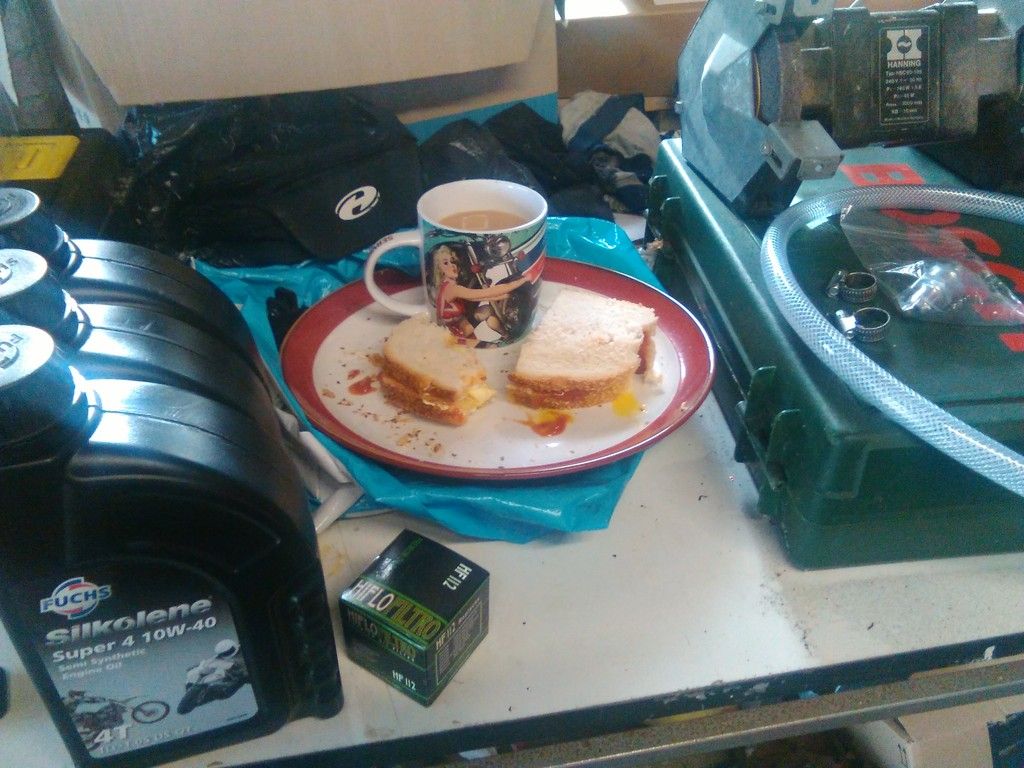 Successful oil & filter change checklist - oil, filter, fried egg (double egg) sarnie, cup of tea in novelty mug from Xmas.